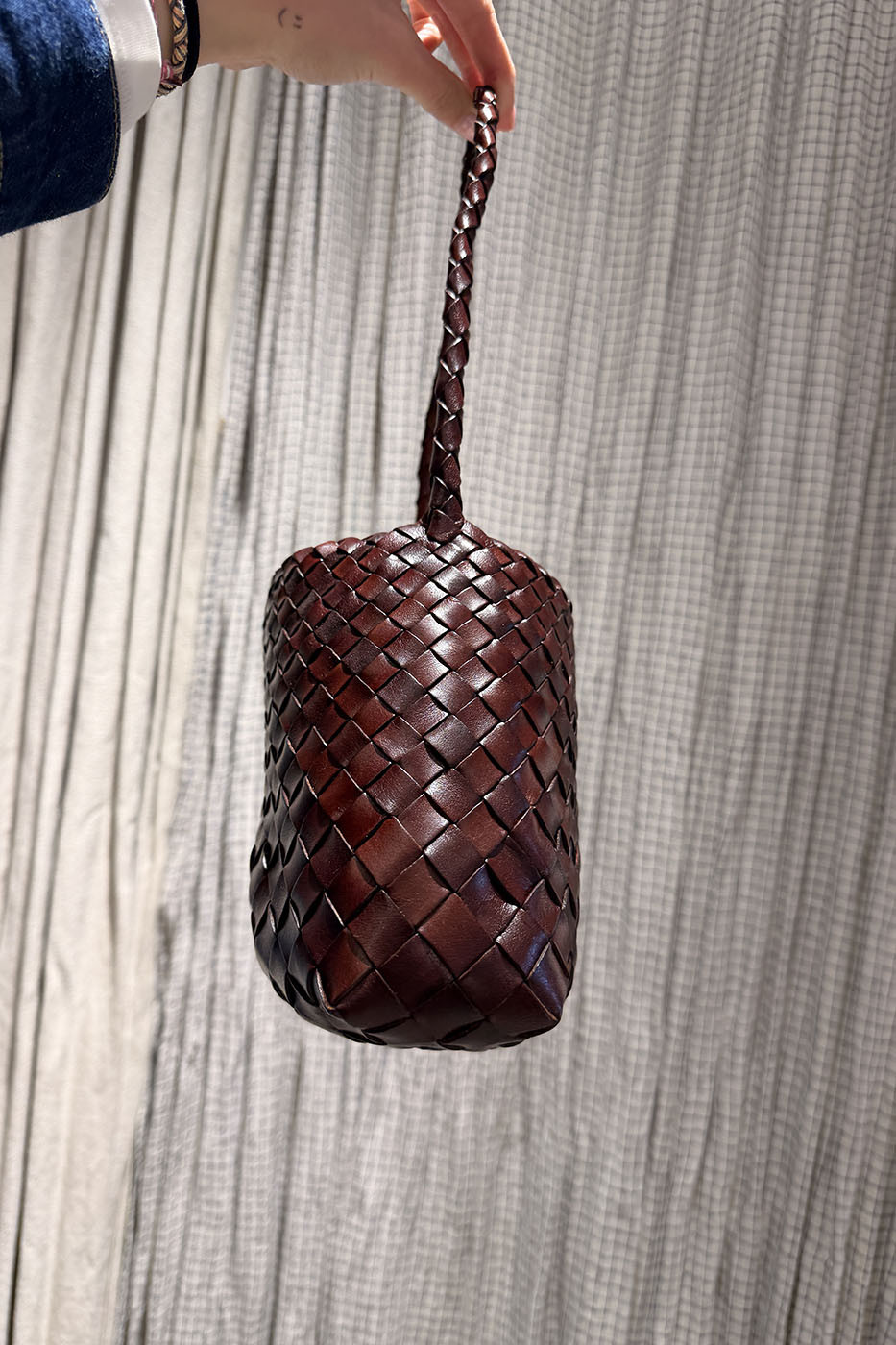 Présentation de "Rosanna" - la quintessence de l'élégance et de la fonctionnalité intemporelles. Fabriqué avec précision et soin, Rosanna est un sac à baguette en cuir tissé qui combine sans effort style et praticité. Sa silhouette unique offre de la polyvalence, vous permettant de le draper sans effort sur votre épaule pour un transport facile.