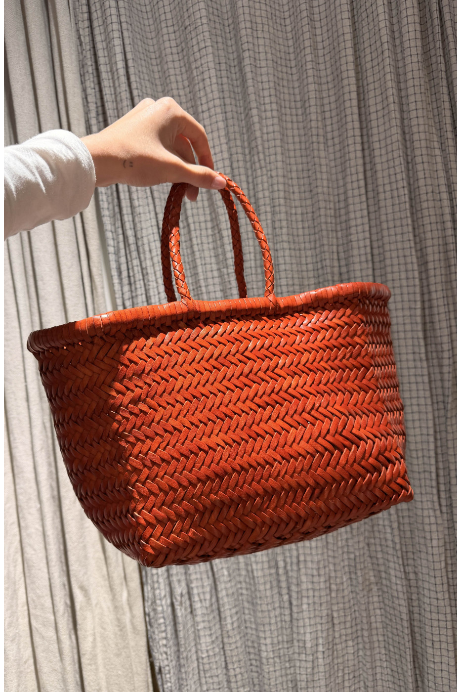 Un panier spacieux tissé à la main en cuir de veau de buffle lisse. Fabriqué à la main par des tisserands artisans en une seule pièce, le tissage du chevron diagonal est ce qui rend ce style unique. Et, en restant fidèle aux techniques traditionnelles de tissage de paniers, le sac est livré sans doublure avec un dessus ouvert.