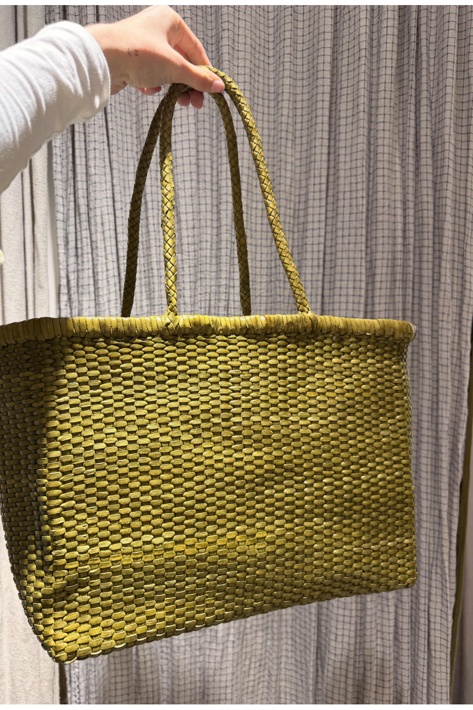 Un panier spacieux et tissé à la main en cuir de veau de buffle lisse. Fabriqué à la main par des tisserands artisans en une seule pièce, le tissage du chevron diagonal est ce qui rend ce style unique. Et, en restant fidèle aux techniques traditionnelles de tissage de paniers, le sac est livré sans doublure avec un dessus ouvert. Idéal pour votre prochaine sortie à la plage ou un voyage sur votre marché local.