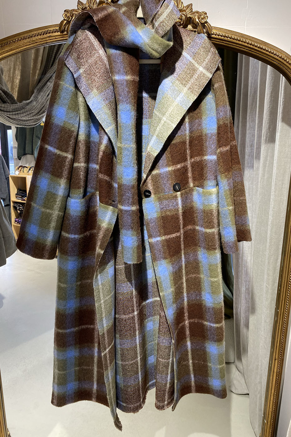 Manteau long en laine mélangée à motif carreaux dans des teintes marron, bleu clair et kaki. Coupe ample et élégante, avec un grand col structuré et deux boutons sur le devant. Tissu doux et chaud, parfait pour l’hiver. Une pièce forte qui sublime immédiatement une tenue, pour un style moderne et sophistiqué.